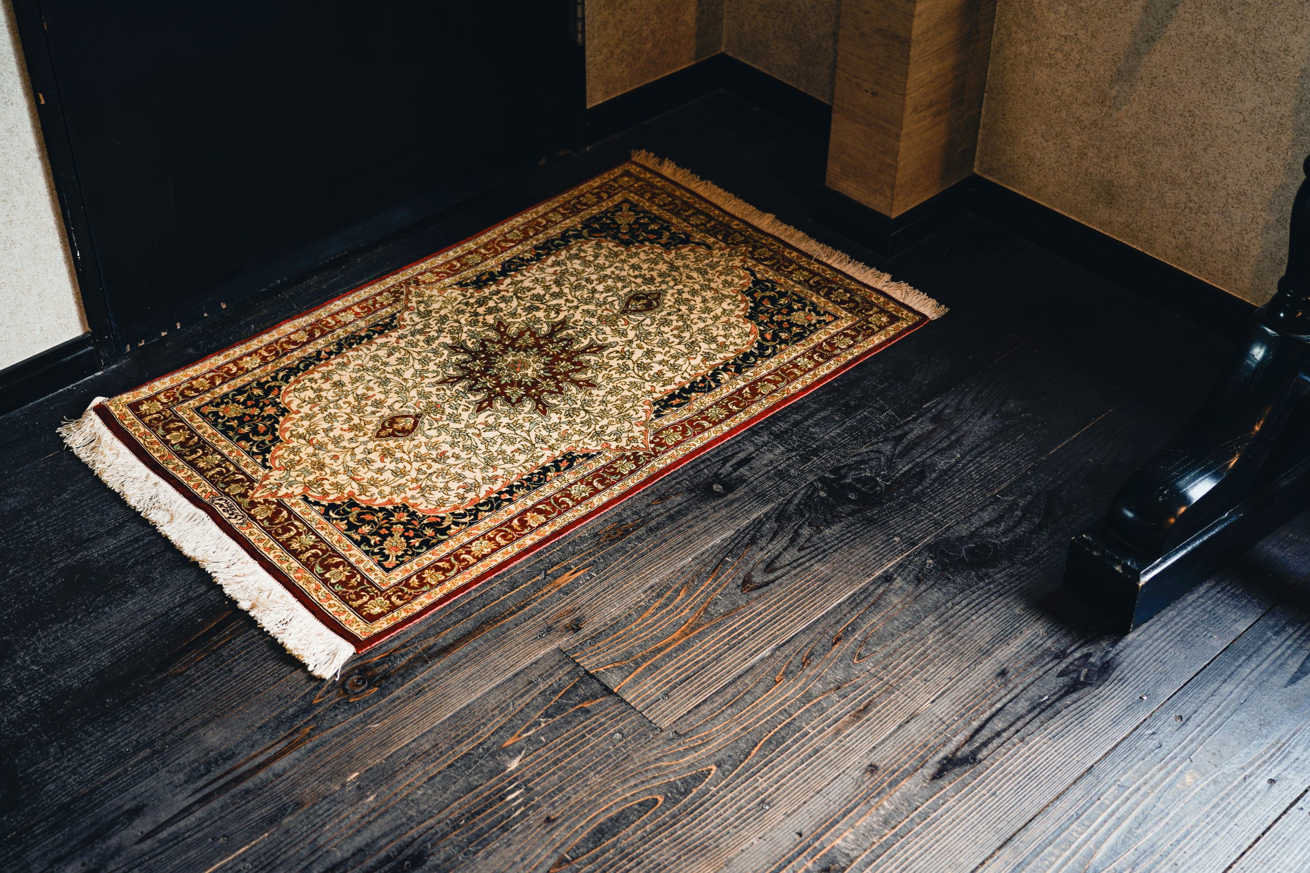 落ち着いた色合いの絨毯がウッドフロアによく似合います。 40cm×60cmサイズです(仮)